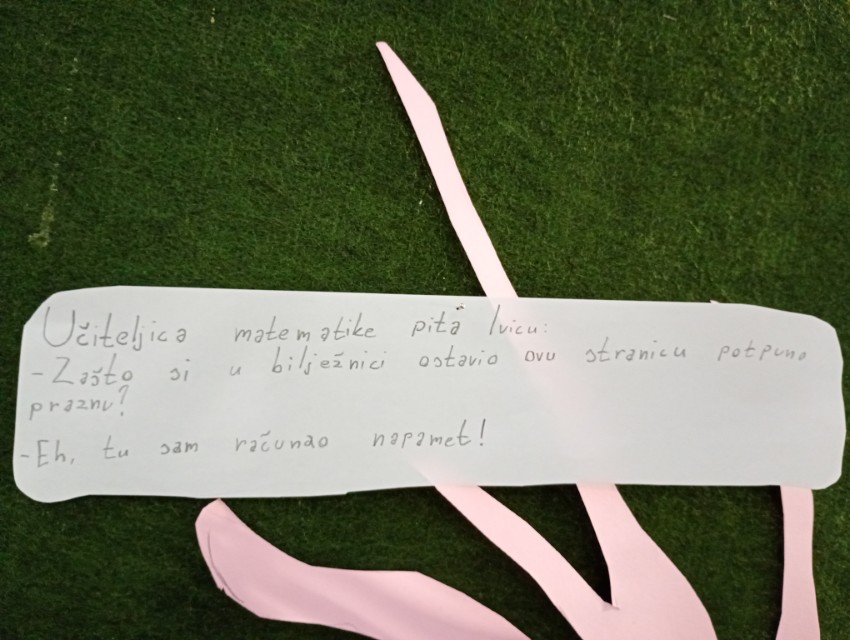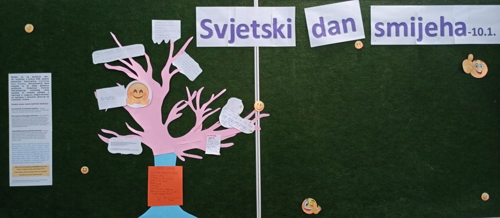 Humor nije jedini način, ali je vjerojatno najzabavniji način očuvanja ili poboljšanja kvalitete života. Može imati različite funkcije, npr. pridonositi emocionalnoj regulaciji, biti jedna od strategija suočavanja sa stresnim situacijama ili poslužiti kao korisna tehnika distrakcije. S ciljem obilježavanja Svjetskog dana smijeha, svi su razredni odjeli u matičnoj školi imali zadatak na Satu razrednika osmisliti razredni vic te ga postaviti na stablo smijeha, na središnjem panou. Učenici su se pritom zabavili i nasmijali, a stablo smijeha dobilo je humoristične plodove.